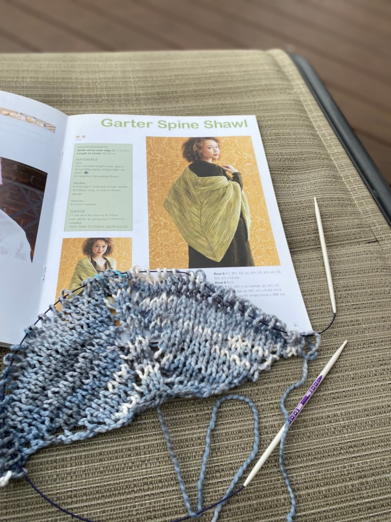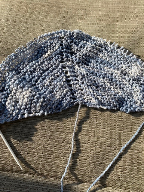 … efter allt detta festande alltså! Riktigt skönt att sitta med en ny stickning nu på kvällskvisten. En ny sjal naturligtvis , men denna utan spets. Enkel att sticka och så rogivande att låta stickorna flyga fram med denna. Jag började faktiskt på den under stickjuntan via skärmen ´på måndagskvällen. Mönstret föreslår att man använder endast rätstickning , men jag måste säga att jag inte var helt förtjust….