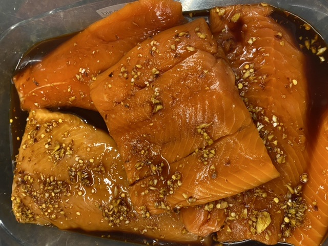 Marinerad Alaska lax i sojasås smaksatt med färsk ingefära, pressade/skurna vitlöksklyftor och cayennepeppar peppar.