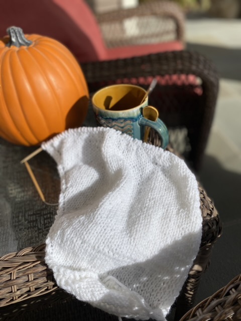 …bjöd på lite av varje faktiskt. Naturligtivs har jag kommit igång med min första dopfilt som skall skänkas till församlingen. Vi får ju se hur många jag knopar ihop… Denna blev ett väldigt enkelt mönster som jag hittade på nätet. Däremot är garnet lite glittrigt, vilket jag inte ville dölja i ngt invecklat spetsmönster. Stickad på diagonalen påminner det mycket om att sticka en sjal. Däremot endast 160 maskor innan jag vänder och börjar ta ner på maskorna igen. På den sjal som jag inte lyckats få klar ännu och har på stickorna är det dubbelt maskantal. Hela 340 om jag minns rätt.