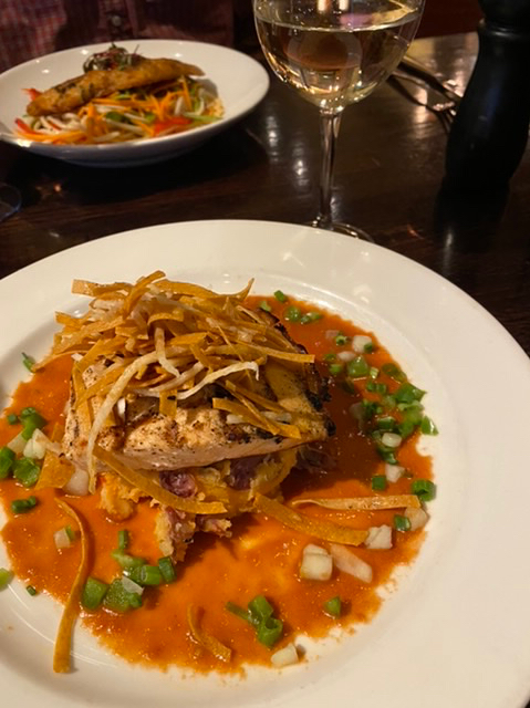 Vi beställde fiskrätter båda två. Jag åt en laxbit som var marinerad i ngn slags vinäger med kryddor och serverad över potatismos med chilisås och hör och häpna gazpacho! Och strimlor med majschips ovanpå fisken. Inte ngt som jag tidigare provat, men smaken var ypperlig trots att laxen var lite överkokt. Maken hade en asiatisk inspirerad fiskrätt med bla Udon nudlar. Jag har aldrig testat dessa nudlar, men han var också mycket nöjd med sin mat.