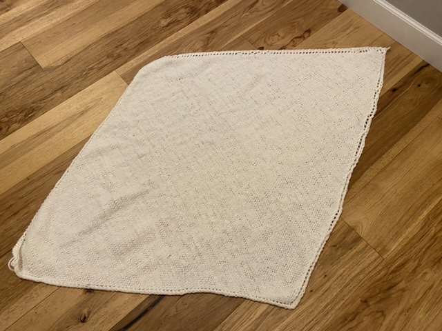 Dopfilten till församlingen blev färdig i helgen också. Den behöver ännu tvättas och blockeras. Garnändarna fick jag fästade under kvällens stickjunta via skärmen. Denna filt stickades med en kant, slätstickning och på diagonalen. Precis som så många sjalar jag stickat. Fort gick det också med endast 160 maskor eftersom det är en filt i storlek baby. . Sjalar har vanligen den dubbla mängden maskor- åtminstone.