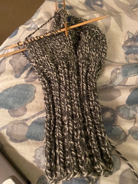 Dagens socka har jag kommit så här långt med. Den påbörjades i eftermiddags med bullarna jäste efter att brödmaskinen hade ställt i ordning degen. Sedan fortsatte stickandet vid skärmen med stickjuntan och efter att garnändar på filten ovan hade fästs, jobbade jag på sockan.