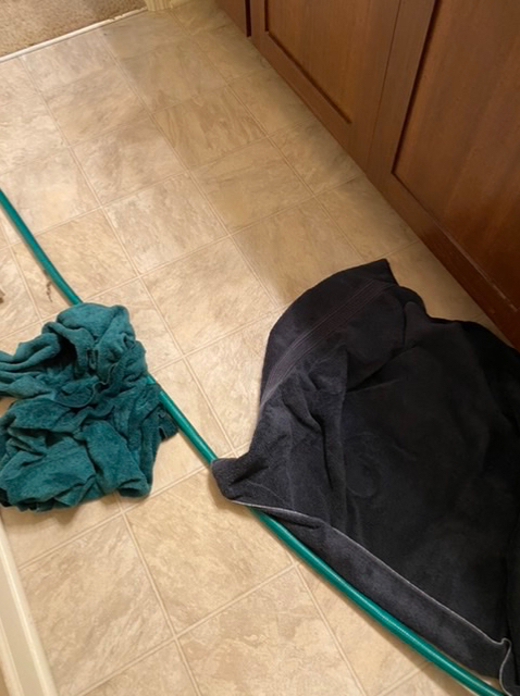 Dyblöta handdukar omger trädgårdsslangen på badrumsgolvet….