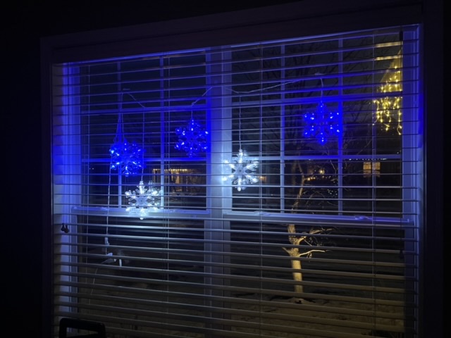 Nu på kvällen påpekade Maken att de upphängda snöflingorna i fönstret också lyser i Finlands vita och blåa färger. Inte illa!