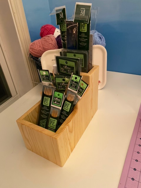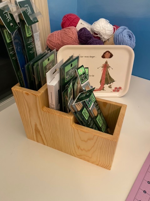 … fick jag av Maken. Jag hade önskat mig en behållare för stickor. Hade ritat en skiss ur minnet av en behållare för pennor som jag hade som liten . En gul i plast. Denna egenhändigt tillverkade behållare fick jag….