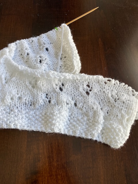 Början på min nya dopfilt. Mönstret var gratis och heter Alex’sbaby blanket’ på Ravelry. Riktigt ett enkelt mönster och riktigt trevligt att sitta och jobba på.