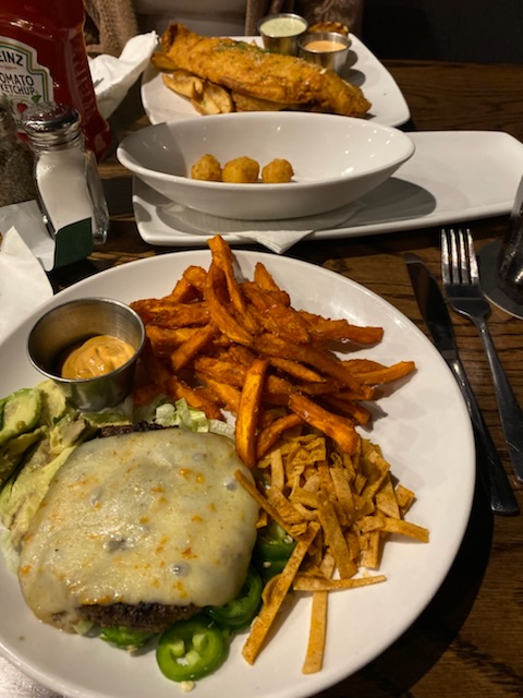Vi valde en av favoritrestaurangerna och det blev hamburgare utan bröd för mig med jalapeños, ostskiva, isbergssallad och guacamole och pommes gjorda på sötpotatis och ‘fish and chips’ för Lillasyster.
