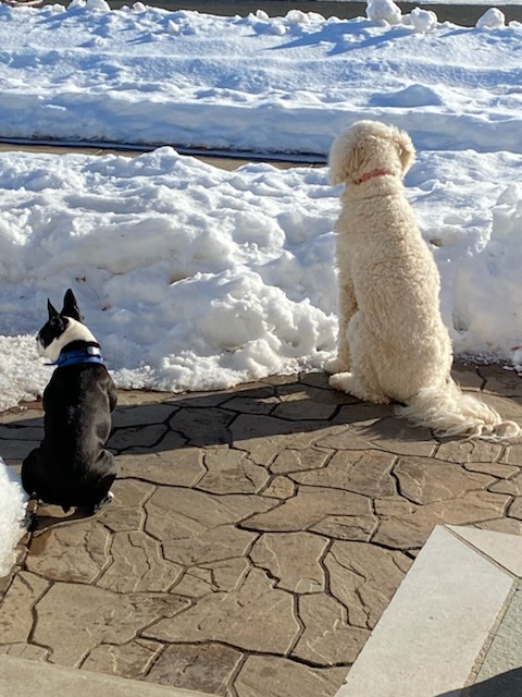 Dessa två höll mig sällskap medan jag stickade. Det fanns en hel del att titta på denna eftermiddag. Till följd av de varma temperaturerna och det vackra vädret var en hel del grannar ute med sina hundar. En del joggande grannar behövde naturligtvis också skällas glatt åt.