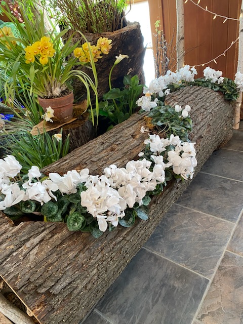 En rad med vita cyklamen ( kanske de inte heter så på svenska?) planterade i en stam tedde sig väldigt fint.