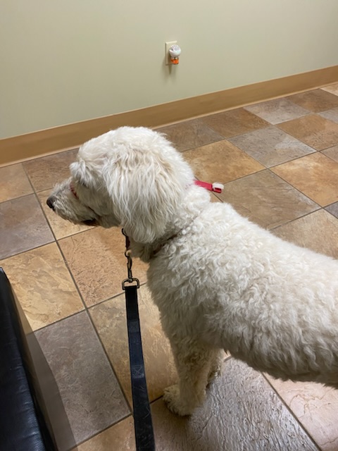 En hunddam som tåligt väntar på att få åka hem igen medan Matte betalar räkningen….. ( kopplet hon har på sig heter “gentle lead” och fungerar som en grimma på en häst. Det är alltså inte ngn slags munkorg.)