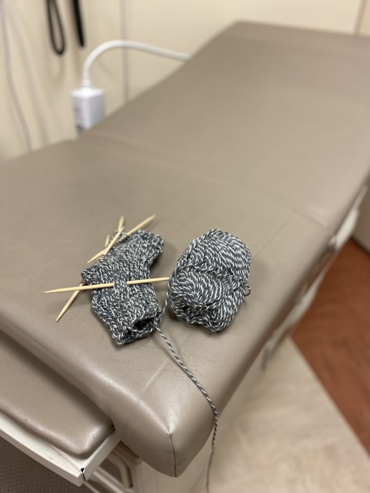 Naturligtvis var stickningen med i undersökningsrummet vid kliniken där jag satt och väntade på läkaren….