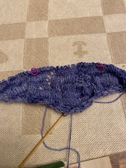 Andra försöket… Här ändrade jag det skrivna mönstret och stickar slätstickning utanför markörerna istället för rätstickning. Tycker slätstickningen ger ett mycket snyggare helhetsintryck. Mönstret ( som jag inte ändrat) kommer i mitten mellan markörerna….