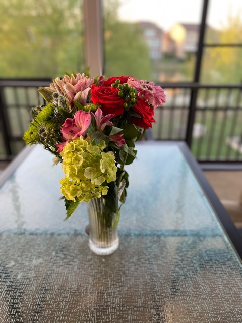 Grattis all mödrar där ute i cyberrymden! Också här i USA firades morsdagen idag och vilken fin dag vi fick! Efter två dagar med välbehövligt visserligen, men strilande regn, klarnade vädret upp på eftermiddagen och solen bröt fram. Min vackra bukett som jag fick av Maken och barnen gjorde sig så fin på verandan! Maken stod i köket trots att han jobbade dygnet hela lördagen och svarvade ihop en väldigt god middag åt oss och sina föräldrar. Hans pappa fyllde 85 år igår och så är det ju då morsdag också.