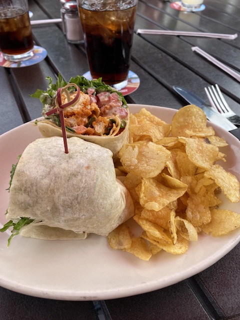 Jag valde en utsökt sk wrap. En slags smörgås med kyckling, sallad, grönsaker och dressing gjord på mögelost. Alldeles utsökt god var den! Och med en så pass stor portion kunde jag inte ens äta allt och fick lämna en hel del av chipsen.