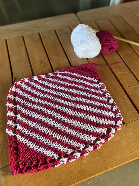 Jo men visst blev en till disktrasa klar… Denna enligt eget huvud och först tyckte jag ränderna var för täta, men nu gillar jag den faktiskt. Detta enkla mönster blir roligt att testa med andra färger också. Efter tvätt och blockering lägger sig maskorna sedan finfint.
