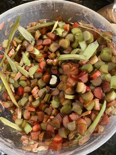 Matberedaren är en hejare på att skära all rabarber jag skördat. Det var Makens ide att använda den och detta knep fungerar alldeles utmärkt och fort går det! Jag bara matar ner stjälkarna precis som jag skulle skiva morötter och undan går det! Det märks säkert att inte allt blir helt skivat, men det gör inte så stor skillnad när rabarbern sedan används till bakverk och annat. Nu är fyra askar nedfrysta i alla fall. Räcker knappast hela vintern, men ngn månad i alla fall…