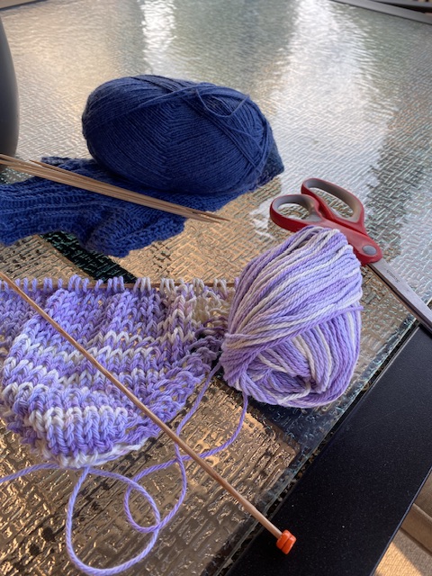 Skall man ha stickjunta framför skärmen behöver allt som skall användas vara i närheten. Kvällen var alldeles underbar med svala vindar och inte varmare än 21 plusgrader. Nästan september väder för våra breddgrader! Alltså var det helt ljuvligt att sitta ute på verandan och sticka denna måndagskväll.