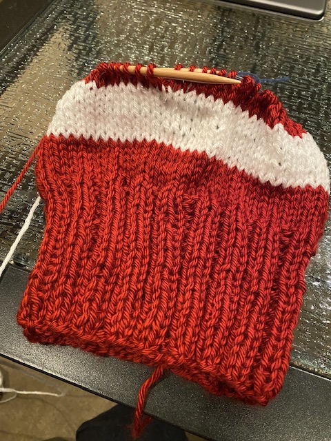 Slutligen sökte jag fram rest garn och hittade ett trevligt rött och ett lika fint vitt som tillsammans får bli en randig mössa. Åt vem har jag ingen aning om, men efter alla dessa disktrasor är det roligt att sticka ngt annat för omväxlings skull….