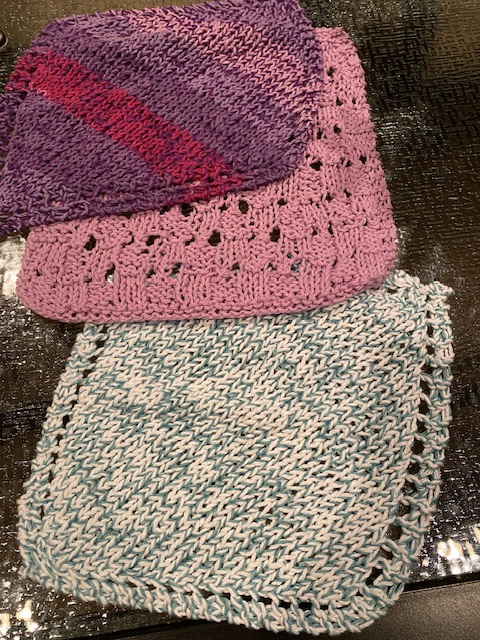 Allra först under stickjuntan färdigställde jag dessa disktrasor. Jag tycker det är så enormt tråkigt att fästa de löshängande garnändarna efter att ett projekt är klart, så det lämnas ofta… Sitter jag med min skärm och stickande väninnor framför mig går det så mycket fortare att få detta tråkgöra gjort!