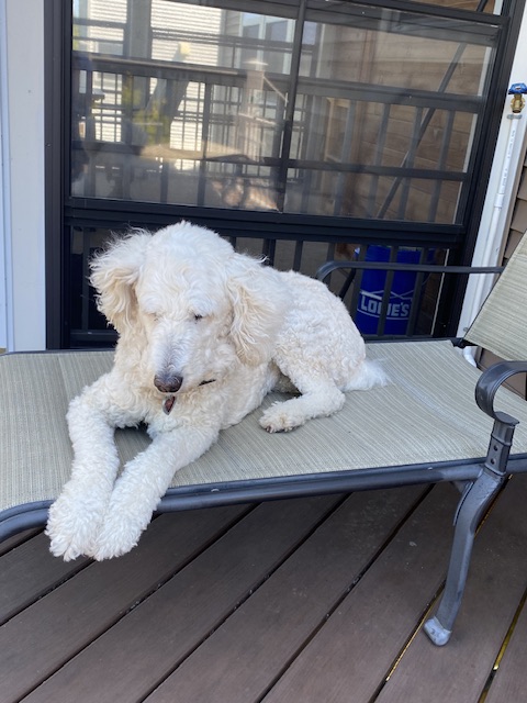 Hunden Lilly blev plötsligt blyg för kameran, efter att just precis ha sett upp på Lill Husse då han satte sitt täcke att torka….