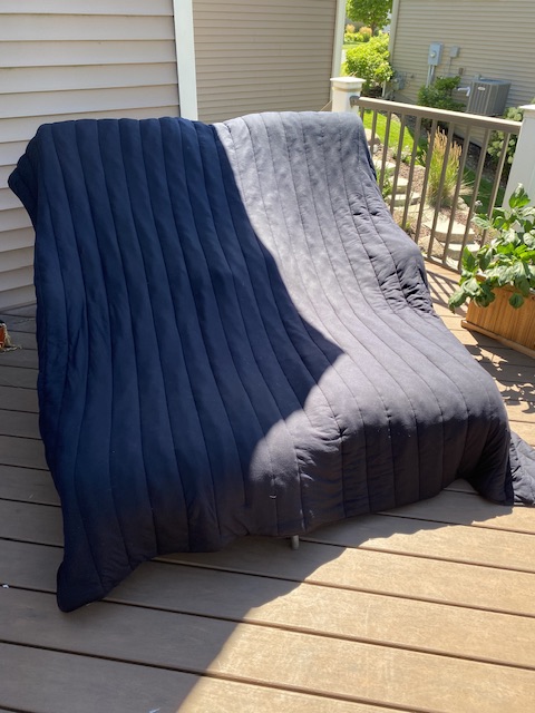 Sonen tvättade sina sängkläder och hängde ut dem över solstolarna i solen på eftermiddagen. Det tog inte länge för augustistrålarna att torka det tjocka täcket.