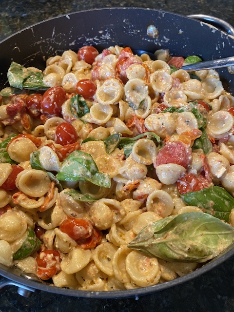 Till kvällsmat blev det åter den berömda TkTok pastan. Alltid lika god och vegetarisk och en riktig favorit hemma hos oss. Serverad med ett gott vitt i glasen för oss vuxna och nygräddat batongbröd. Eftersom det inte blev varmare än 29 plusgrader och vindarna var torra och svala hela dagen smakade det alldeles utmärkt med denna rätt till middagen.