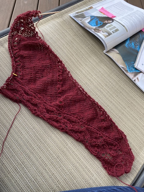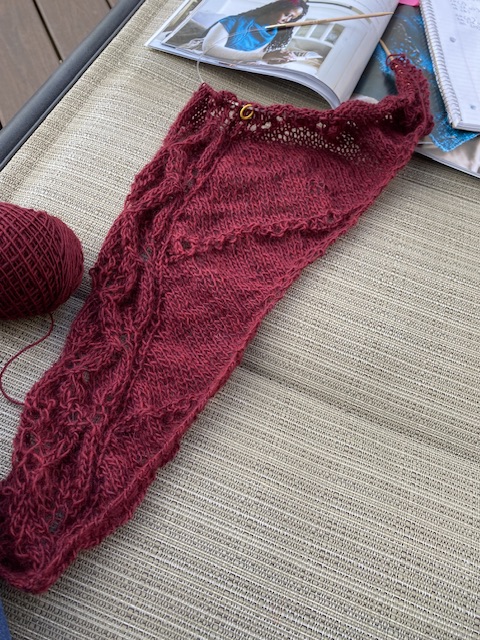 Det har stickats en hel del måste jag säga. Mera än vanligt! Så kan det gå när ett nytt mönster påbörjas och det är bara så himla kul! En ny sjal med en spetskant. I rött, alltså INTE favoritfärgen blått denna gång! Hör och häpna!