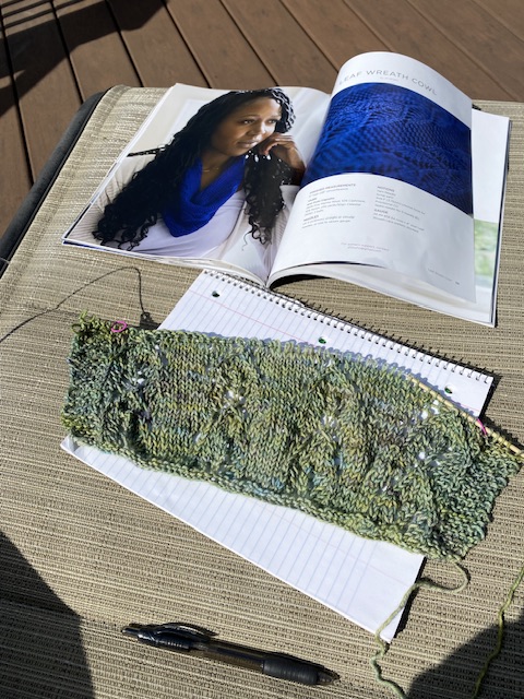 Projektet ovan skall bli en halsduk åt Lillasyster i mjuk cashmere. ( möjligen samma ord på svenska…?) Ett garn som jag råkade hitta till fyndpris vid den lilla, fina garnbutiken vi har här i Förorten.