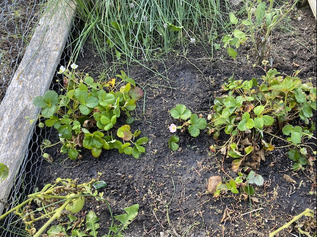 På söndagen ägnade jag mig åt mitt stackars trädgårdsland som verkligen inte fått mycket uppmärksamhet denna sommar. Jag planterade de två jordgubbsplantorna som jag köpte i krukor i juni i jorden för att förhoppningsvis ge dem en chans att överleva vintern.