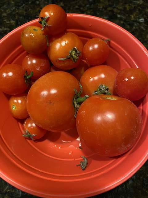 Tomatskörden denna september är väldigt liten och tomaterna är rätt vattniga och inte särskilt goda faktiskt. Synd, men jag gissar att det nog beror på den enormt torra sommaren. Visserligen har gräsmattans bevattningssystem vattnat tomaterna på samma gång gräsmattan blivit bevattnad, men i och med Förortens restriktioner på bevattningen till följd av torkan, inte kanske tillräckligt ofta.