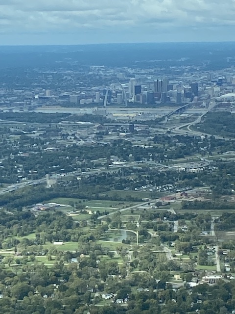 Detta är staden St.Louis i delstaten Missouri sedd från luften. Sonen tog bilden från planet som han och pilotkomipisen flög ända från delstaten North Dakota hit. Det blev en resa på runt 2 400 km! De flög dessutom ett litet plan, en Cessna 150 och hade dåligt väder. Resan som skulle ta 6-7 timmar, tog hela 26 timmar med en övernattning på hotell i delstaten Illinois. Idag, söndag vid 11.30 landade de som planerat i St.Louis i god tid till flygtävligen som börjar inkommande tisdag. Och om ni undrar om det var en aning nervöst för oss föräldrar är det bara att bekräfta att så var fallet. Skulle vädret ha varit bättre för flygningen skulle det ha varit en aning lättare att hålla nerverna under kontroll, men konstant låga moln, blåst och regn under hela resan gjorde att tankarna fanns hos de flygande ungdomarna sgs hela dagen….