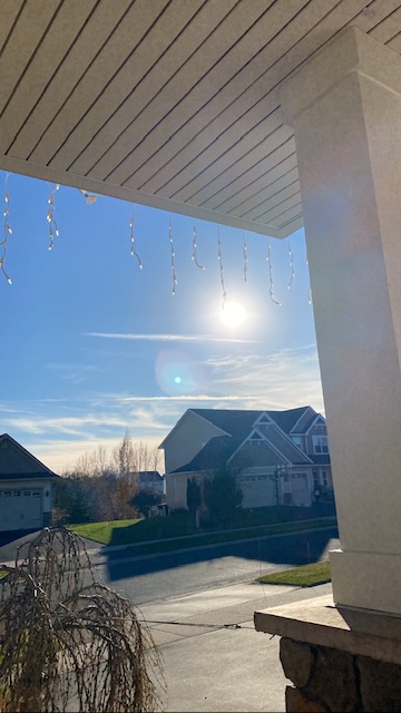 Solen gassar ner på mig och som ni ser är vår julbelysning uppsatt. Dock ännu inte påslagen på kvällarna. Maken sätter alltid upp den i november någon varmare dag, typ när det var kring 10 plusgrader för två veckor sedan. Det är ju normalt varmt för november, inte 20 plusgrader!