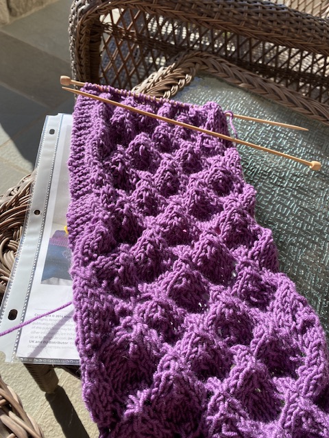 Det blev verkligen en skön stund där ute i solen denna eftermiddag och stickorna flög fram. Mycket nöjd med det nya mönstret och garnet är jag och hoppas få denna halsduk klar om några dagar.