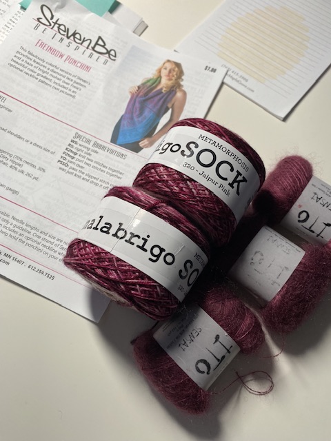 Mösntret är en sjal som man syr ihop på den ena sidan och så bildar sjalen en liten poncho som designern Steven Be kallar ponchini. Väninnnan och jag valde alltså samma mönster och samma garn, men hon valde färger i lila och jag i rött. Detta skall bli roligt att sticka. Man håller två olika slags garn i handen på samma gång man stickar. Vi skall nämligen till en gemensam stick helg i januari och tänkte då ta oss an detta mönster.