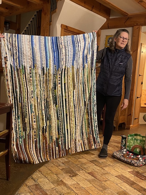 En av väninnorna är fantastisk duktig på att sy lapptäcken. Här visar hon upp en egen design som hon håller på med åt en annan bekant. Detta lapptäcke skall så småningom hänga på en vägg i en stuga ännu längre norrut i delstaten vår. Om jag känner sömmerskan rätt, kommer slutresultatet att bli ngt alldeles extra.