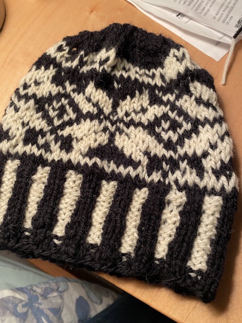 Jag har börjat på en mössa i restgarner och använder stjärnmönstret ur boken och gör min egen design. Spännande och roligt!