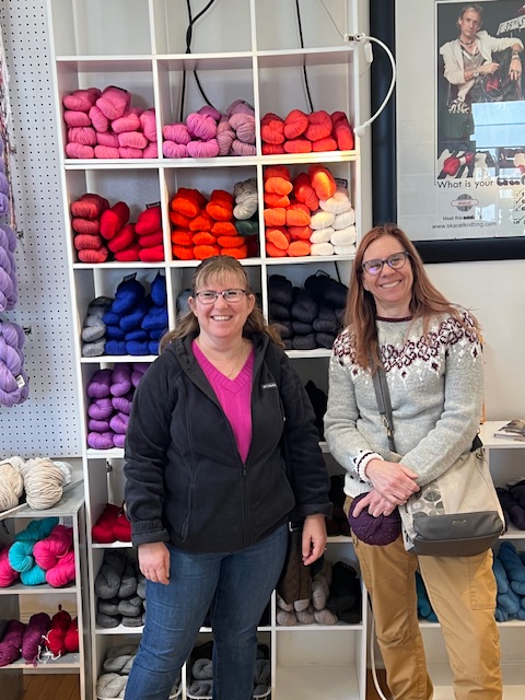 Här poserar Väninnan och jag i den övre våningen i den fantastiska affären. Och jodå, mycket riktigt. Väninnan har stickat tröjan hon har på sig. Ngt annat trodde ni väl ändå inte…?