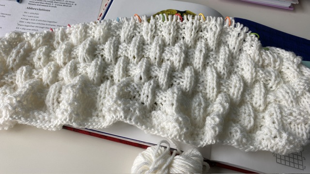 Det här med mönster stickning från diagram börjar sitta nu när jag förstår mig på diagrammet och jag kom en bit längre på den senaste baby/dopfilten för församlingen den här gråa och mycket snöfattiga februarilördagen! Nu är jag nästan utan det vita garnet av merinoull som jag använder till filten så den får ligga medan jag väntar på leverans inkommande vecka. Det går rätt snabbt att sticka denna filt nu när mönstret och jag kommer överens och roligt är det!