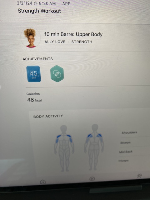 Jag tränar sgs dagligen. För min egen hälsas skull. Ngn idrottare har jag aldrig varit och definitivt ingen elit sådan. Peloton som jag tränar digitalt med sätter upp alla möjliga olika mål och milstolpar och i förmiddags fick jag detta lilla märke då jag hade jobbat med armarna en liten stund. Jag har tränat hela 45 dagar i rad!