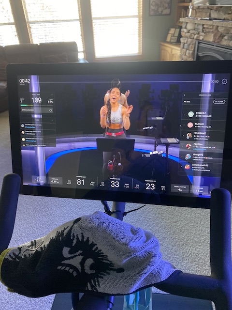 Denna onsdag var det dock ingen vilodag och här på skärmen syns den enormt duktig instruktören Robin som hade ett cykel/spinning pass från studion i New York som jag deltog i. Hon är verkligen duktig. Före detta advokat, numera Peloton instruktör och mamma till två små barn.