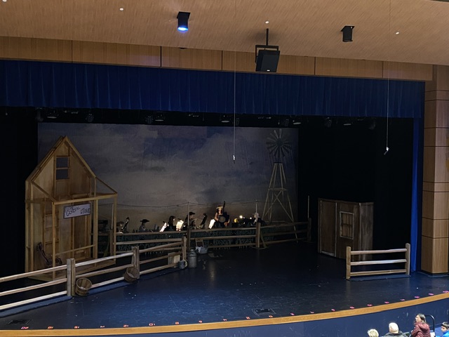Man får ju inte ta bilder eller filma under själva föreställningen till följd av copyright lagar , men så här såg scenen ut. Till vänster syns Aunt Eller’s General Store och till höger syns the smoke house. Längst in i bild syns den lilla, men mycket duktiga orkestern som nästan helt bestod av elever. Dirigenten, som också spelade piano var en lärare, men resten av musikanterna var elever.