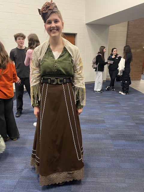 Dräkterna är naturligtvis tidsenliga och väldigt fint sydda. Här poserar Lillasyster som fick rollen som Aunt Eller. En rätt arg tant i medelåldern som håller koll på det mesta i den lilla byn ute på vischan i Oklahoma. Ungdomarna har dessutom varit väldigt duktiga på att öva in en sydstatsbrytning, och för oss ‘northerners’ var det nästan svårt att förstå dem ibland!