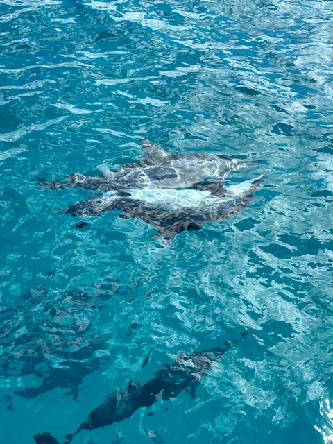 Lillasyster snubblade och stötte i stortån så pass ordentligt att den började blöda och fick plåstras om utav en av personalen på katamaranen. Ändå var resan inte helt bortkastad. Fina fiskar sågs medan de snorklade och en stor sköldpadda simmade alldeles bredvid Lillasyster. Ett stort stim delfiner höll sig nära båten ett tag och visade till och med sina konster. Hoppade upp och ner i vattnet alldeles nära båten.