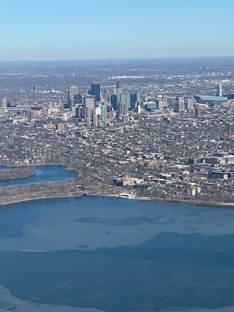 Maken knäppte denna fina bild av Minneapolis från planet i söndags då vi höll på att landa. Som ni märker har vi fortfarande ingen snö och till råga på allt har isarna smultit från alla sjöar och vattendrag. Vi slår värmerekord på värmerekord och idag vid 18 tiden tog jag följande bild: