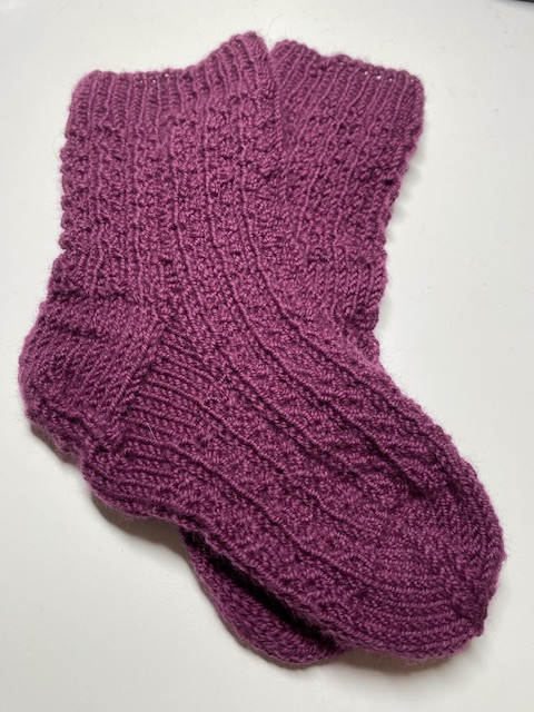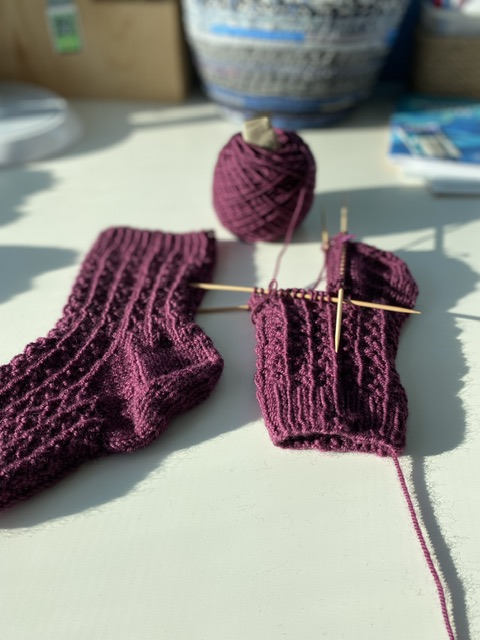 Eftersom jag fortsätter med detta babyfilt stickande för församlingen, hade jag, dagen innan beställt mera garn, så det är på väg i alla fall. Det kommer från delstaten Kentucky om jag kommer ihåg rätt, så det tar några dagar…. Under denna väntan är det lika bra att färdigställa andra projekt som jag har påbörjat. Denna soliga, men väldigt blåsiga eftermiddag tog jag tag i sockorna jag påbörjat för ett tag sedan. Riktigt roligt att sticka med fem stickor igen måste jag säga! Färgen tycker jag mycket om och mönstret var verkligen kul det med.