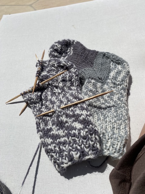 Jo men visst hann de bli klara och gladare mottagare får man söka efter med ljus och lykta måste jag säga! Golven i hemmen inomhus i Arizona är ofta gjorda av kakel och sten och kan bli rätt kyliga under de kalla månaderna, trots att det inte blir kallare än 0 grader på vintern som kallats. Dessa sockor kommer att bäras av värdinnan under kyliga filmkvällar inomhus och under stickjuntan denna måndagskväll påbörjade jag ett par sockor för värden, som väldigt gärna också ville ha ett par. ( Viill bara påpeka att garnet är melerat och båda sockorna är stickade i samma garn.)