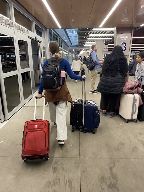 När bagaget äntligen kom var Lillasyster reseproffs och tog hand om alla väskor på en gång. Visserligen hade vi med oss varsin mindre kappsäck, men lustigt såg det ut när hon stegade iväg till bilen med alla våra kappsäckar.