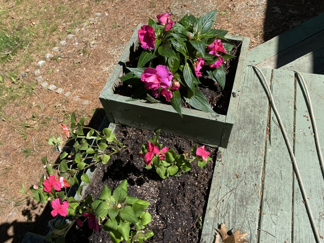 Glatt förvånad var jag när vi upptäckte att det fanns en del att välja på vid växthuset trots den sena timmen så att säga. ( Dvs sent i säsongen för plantering.) Vid hemkomsten till stugan igen hjälpte Maken mig arrangera krukor och verktyg så att jag mest fick sitta och plantera. Det gick väldigt bra och vi hjälptes åt. Jag planterade och Maken sprang ner till sjön för att hämta vatten och vattnade vartefter blomlådorna och de två krukorna blev klara.