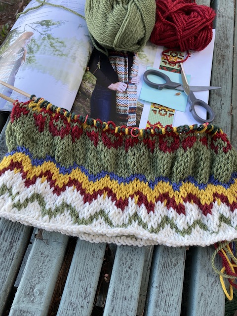 Naturligtvis har det stickats och mängden garn jag har med mig denna gång kan verka en aning mäktig kanske… ? Däremot handlar det om restgarner eftersom jag hittade ett så häftigt mönster på en halsduk. Den stickas på rundsticka som en jättelik mössa. Sedan när halsduken är klar sys ändarna ihop. Den blir väldigt tjock dessutom.