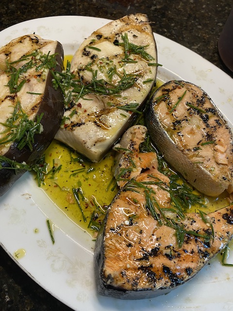 På bilden ovan ses svärdfisken och laxen strax innan servering. Svärdfisk, som i regel med fisk, är väldigt mild i smaken. Precis som lax är den fet i köttet och passar utmärkt på grillen. Gissar det blir flera ggr som vi grillar svärdfisk.